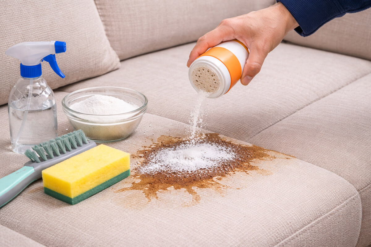 Baking soda is an effective follow-up treatment after liquid cleaning. It absorbs moisture, lifts remaining pigment and neutralizes odors trapped in the upholstery.