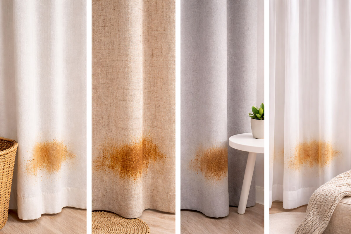 Excessive moisture can cause water rings, uneven drying or shrinkage. Hot water sets tannins and may distort delicate fibers. Rubbing can fray threads or spread the stain into surrounding areas. Bleach and harsh chemicals weaken fibers, cause yellowing and create uneven fading, especially on curtains exposed to sunlight.