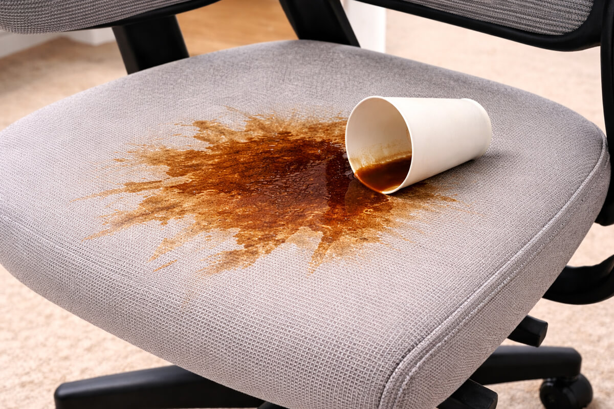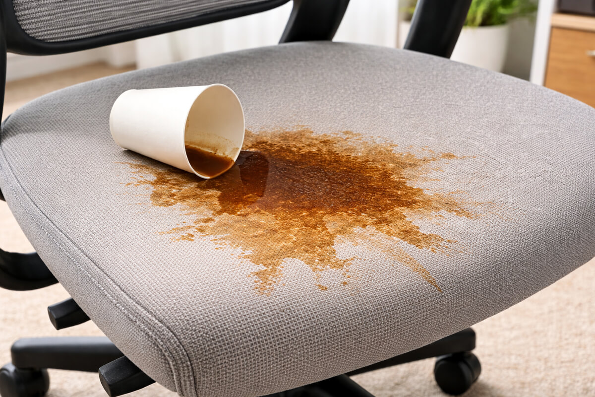Office chairs are positioned directly under desks where coffee cups are frequently placed. Spills often occur near armrests, seat fronts and lumbar areas, which are zones of high pressure and movement. Unlike dining chairs, office chairs are rarely cleaned immediately after a spill because work continues uninterrupted.